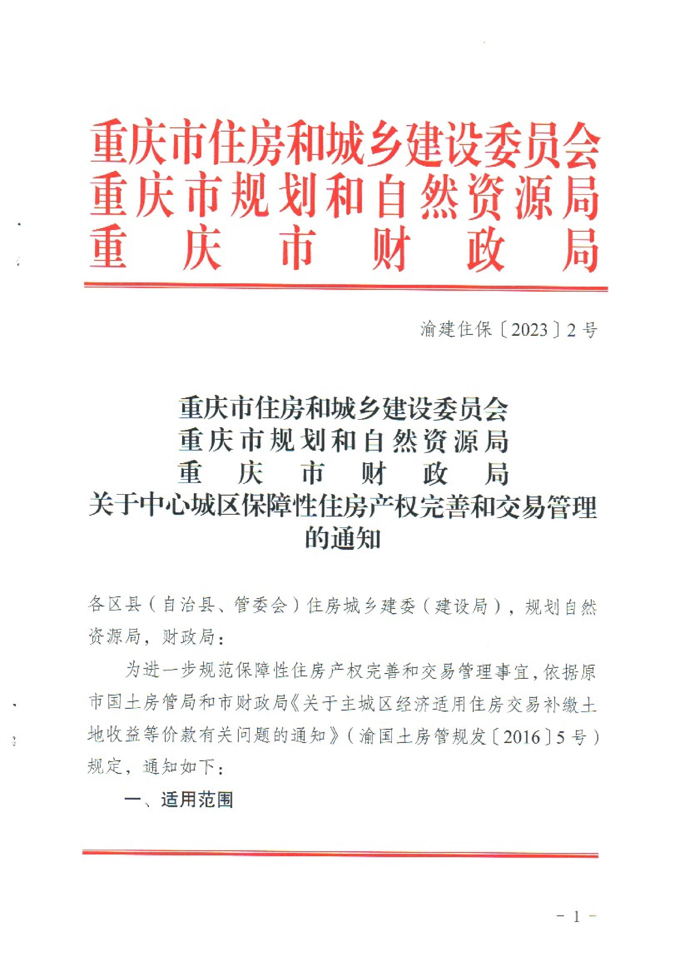 重庆市住房和城乡建设委员会 重庆市规划和自然资源局 重庆市财政局关于中心城区保障性住房产权完善和交易管理的通知(渝建住保〔2023〕2 )